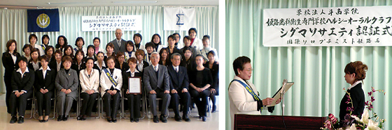 2009年1月14日「学校法人斗南学院 姫路歯科衛生専門学校ヘルシーオーラルクラブ」のシグマ・ソサエティ認証式を、日本中央リジョンメンバーシップ委員会委員長小泉志のぶ様、委員辻容子様ご出席のもと、執り行いました。同クラブの口腔ケアを通じた高齢者の健康維持増進をはかる奉仕活動を支援してゆきたいと思います。