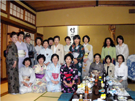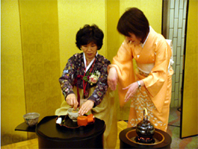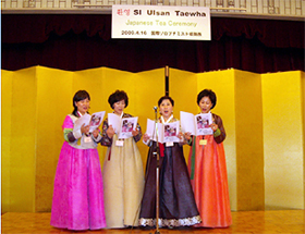 ![]() 裏千家坐忘斎御家元好みの和親棚を使い、盆略手前にて皆様に一服ずつ差しあげました。その後、SI Ulsan Taehwa会員お1人ずつ自ら茶筅にて茶を点てていただき、とても感激され、よい思い出となりました。 |