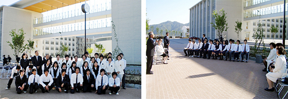 贈呈式には校長先生・教頭先生並びに諸先生方、生徒19名、国際ソロプチミスト姫路西会員8名が出席し、それぞれの挨拶のあと、時計の前で全員の記念写真を撮影いたしました。素晴らしい校舎への登下校時、朝に夕に時を知らせてくれる時計が生徒たちに活力を与えてくれればと願っています。
