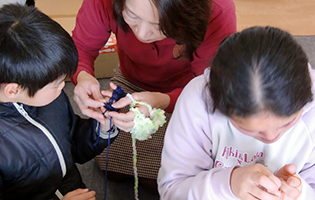 指編みは編み針が不要で、毛糸さえあればマフラーでもシュシュでも手軽にすぐに編めます。小学生から高校生まで15名ほどの子供たちは色とりどりの毛糸を楽しそうに選び、会員の指導により編み始めました。それらを作っている時の子供たちの輝く瞳や小さな子供に優しく教える高校生の姿が印象的でした。