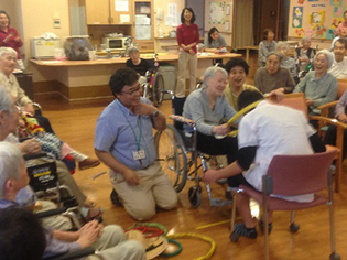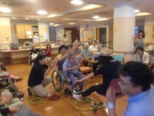 光都学園の生徒たちが指編みで完成させたひざ掛けの贈呈や歌のプレゼントを行ない、つづいて輪投げなど、楽しい遊びに終始笑い声が会場いっぱいに溢れました。最後に生徒たちが点てたお抹茶を入居者に運び、それぞれのテーブルで一緒にお茶をいただきながら談笑し、有意義なひと時を過ごしました。
