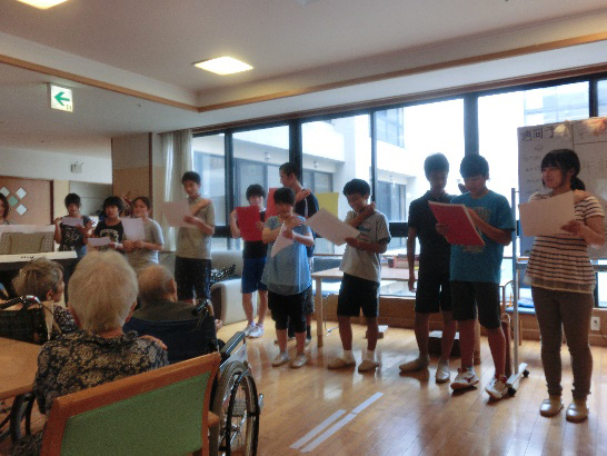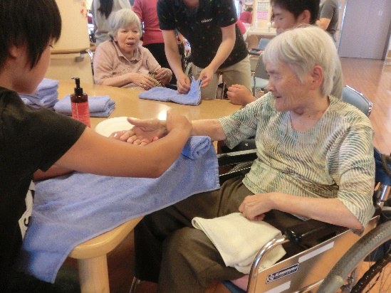 アメニティホーム光都学園(児童養護施設)の生徒と介護老人福祉施設なごみの里入居者との交流会を企画しました。日頃は高齢者に馴染みの少ない生徒が特養の入居者に楽しんでもらおうと、アロママッサージを練習し一人ひとりに心を込めて行いました。 その後、歌を披露したり呈茶をし、入居者のたくさんの笑顔と感謝の言葉に、生徒と共に有意義なひと時を過ごすことができました。